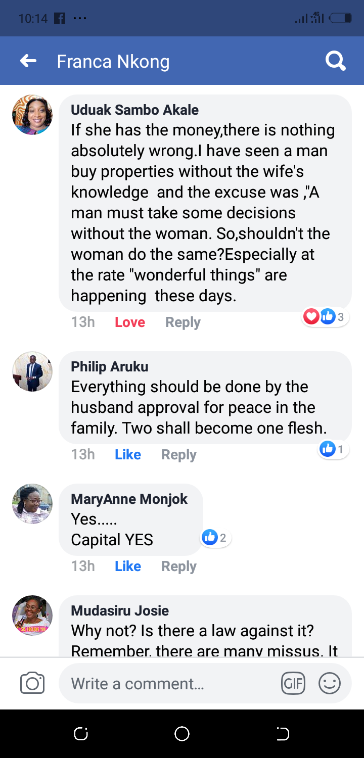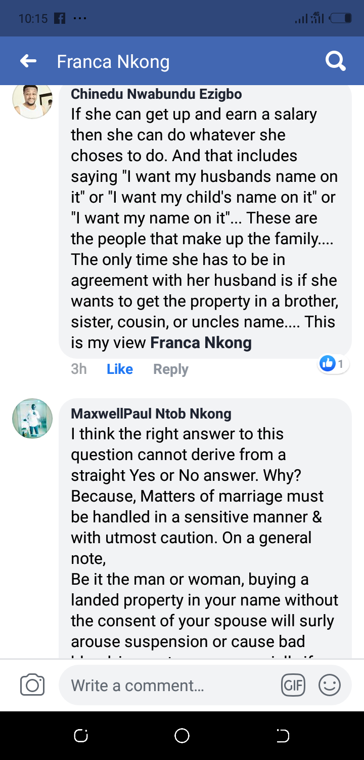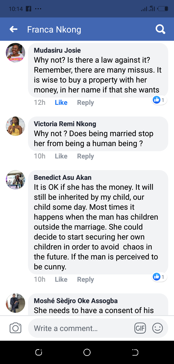 Is it out of place for a woman to protect herself by buying property in her name, I took to Facebook to get the responses in the screen shots.