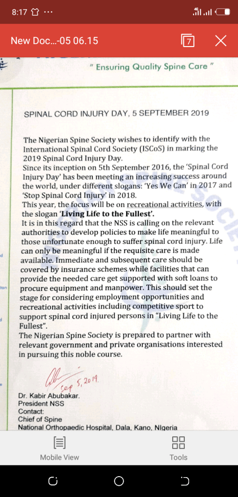 “It is in this regard that the NSS is calling on the relevant authorities to develop policies to make life meaningful to those unfortunate enough to suffer spinal cord injury. Life can only be meaningful if the requisite care is made available. Immediate and subsequent care should be covered by insurance schemes while facilities that can provide the needed care get supported with soft loans to procure equipment and manpower. This should set the stage for considering employment opportunities and recreational activities including competitive sport to support spinal cord injured persons in “Living Life to the Fullest”.