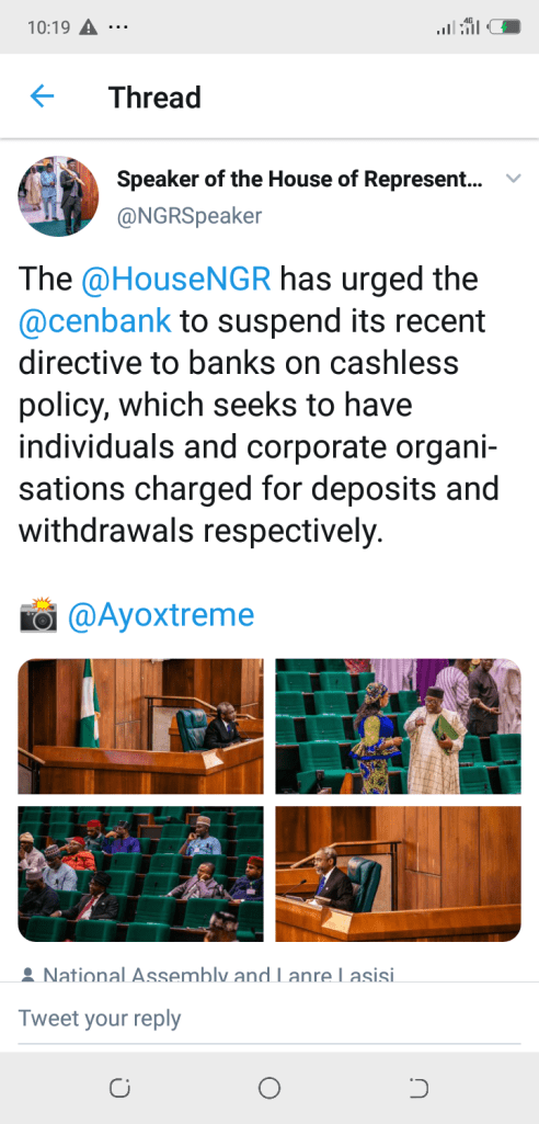 The house of reps has urged the Central bank to suspend the cashless policy till further notice.
