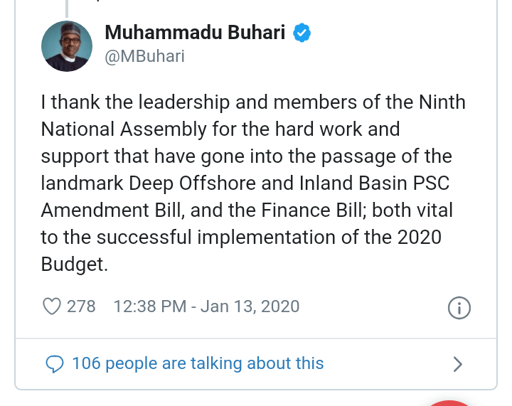 “I thank the leadership and members of the Ninth National Assembly for the hard work and support that have gone into the passage of the landmark Deep Offshore and Inland Basin PSC Amendment Bill, and the Finance Bill; both vital to the successful implementation of the 2020 Budget,” the president tweeted.