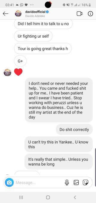 Mr Patrick reached out to Davido in hope of compensation but it was futile, he shared screenshots of their conversation.