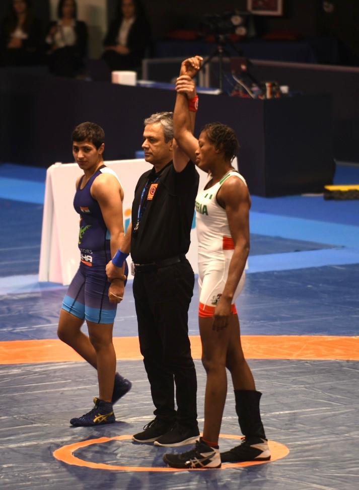 The Minister praised the former world no 1 wrestler for knocking out her opponent Indian Anshu Anshu 10-0 via technical superiority to clinch the gold in that category.