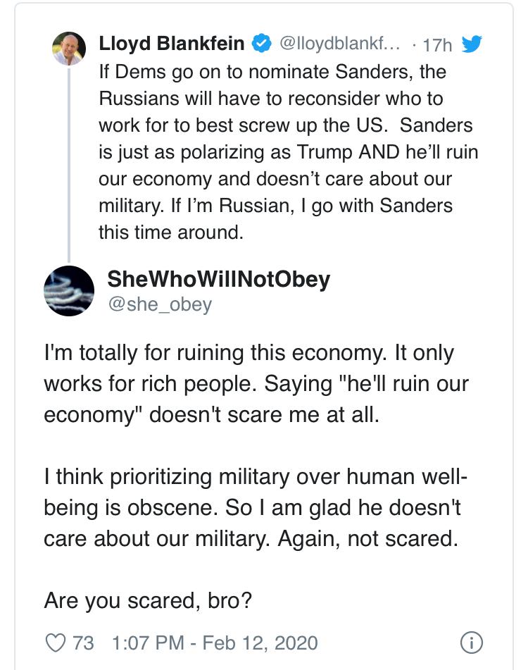 In the wake of Sanders’ New Hampshire primary win Tuesday night, Blankfein sent out a tweet that took shots at both Sanders and President Donald Trump.