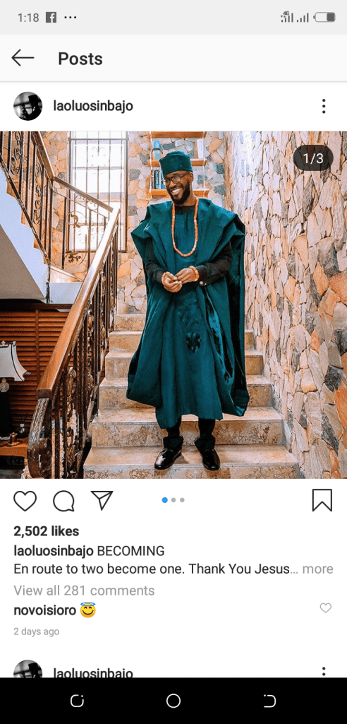 A very excited Laolu shared pictures of his wife and him in matching teal green outfits from their traditional wedding.