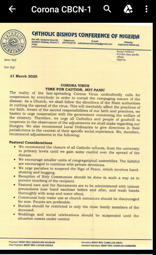 In line with global efforts to curtail the spread of Covid-19, the Catholic Bishops Conference of Nigeria had called for the closure of all Catholic schools.