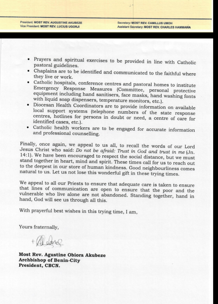 A communique signed by most Reverend Augustine Akubueze, Bishop of Benin diocese also prescribes suspension of the kiss of peace as well as common cisterns for holy water.
