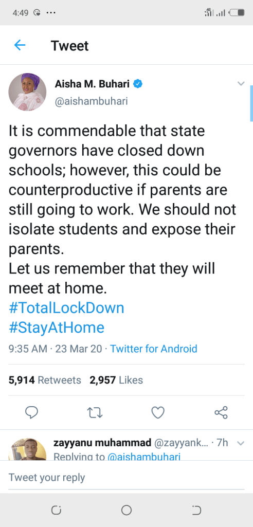 — Aisha M. Buhari (@aishambuhari) March 23, 2020