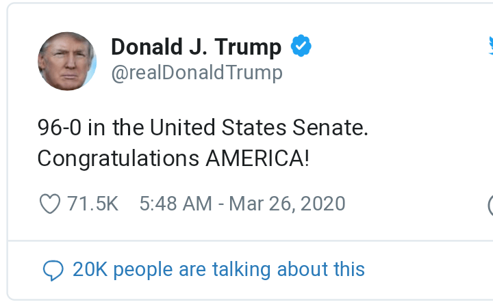 “96-0 in the United States Senate,” President Trump wrote on Twitter. “Congratulations AMERICA!”