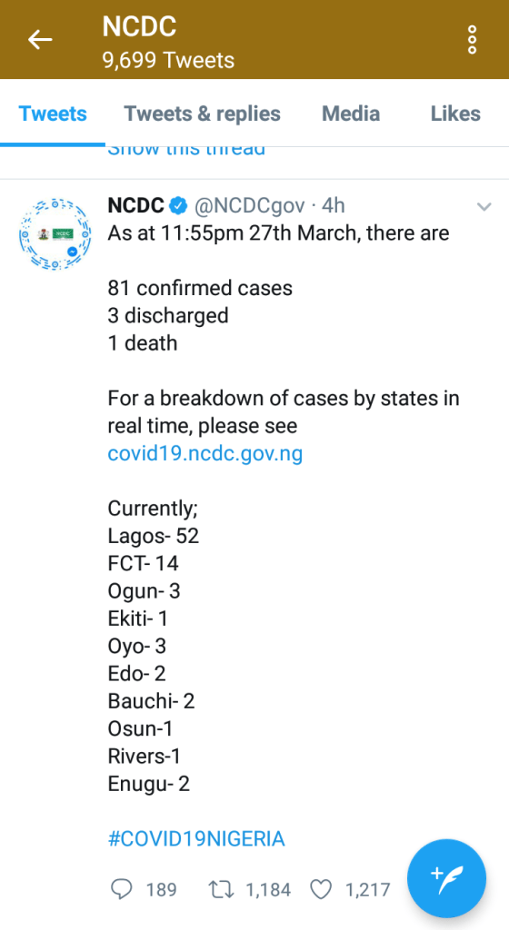 11 more cases of Covid-19 have been confirmed in Nigeria bringing the total to 81. 8 of the new cases are in Lagos, 2 in Enugu and 1 in Edo state.