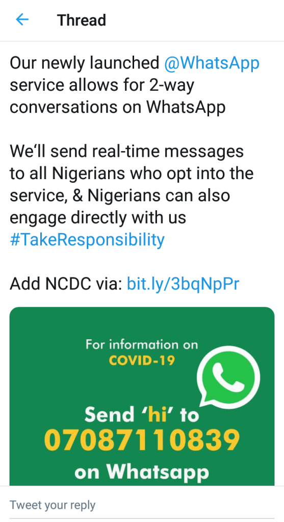 The Nigeria Centre for Disease Control (NCDC) has introduced a WhatsApp service to enable it better communicate to Nigerians,how to curtail the spread of coronavirus (COVID-19) in the country.