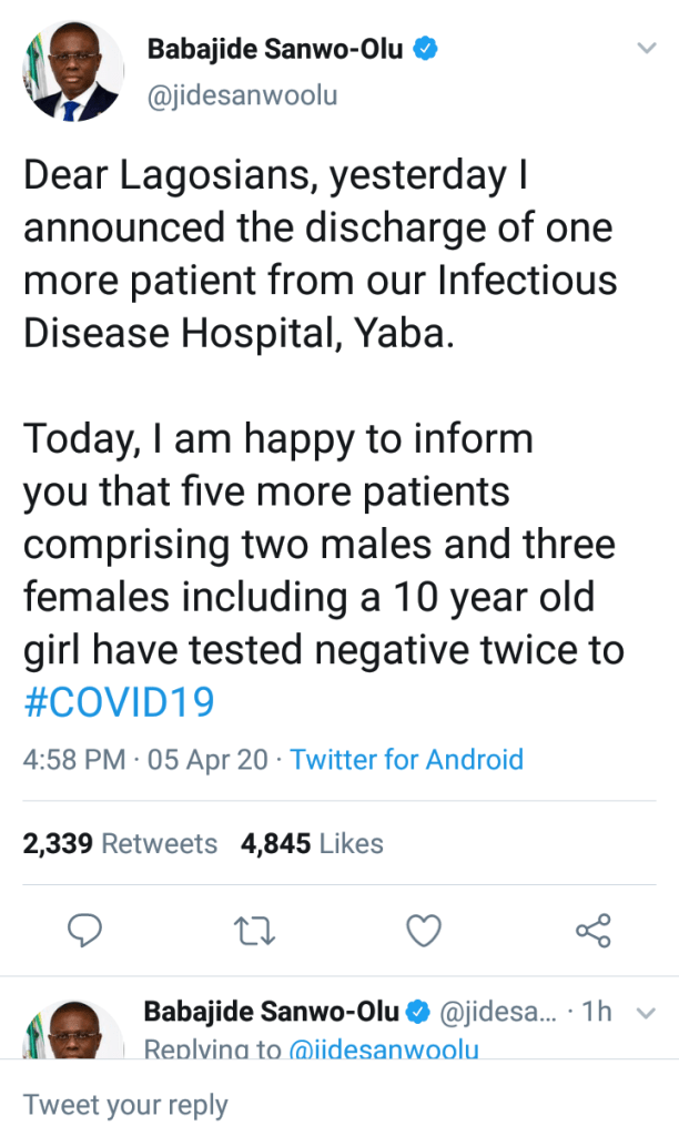 The Lagos state government says it has discharged five more coronavirus (COVID-19) patients in Lagos State who have recovered from the virus.