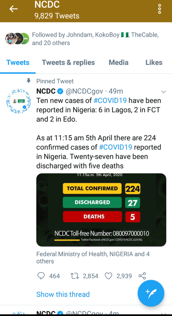 The NCDC has reported ten new cases of Covid-19 in Nigeria. Six of the cases are in Lagos, two in the FCT and 2 in Edo State.