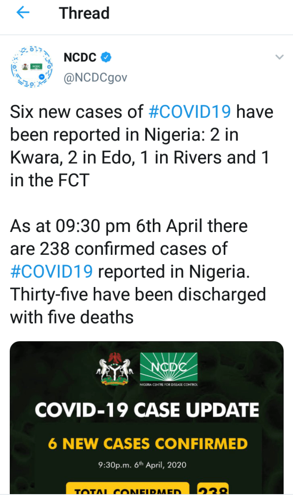 The NCDC has reported 6 new cases of Covid-19 in Nigeria. This brings the total number of confirmed cases to 238.