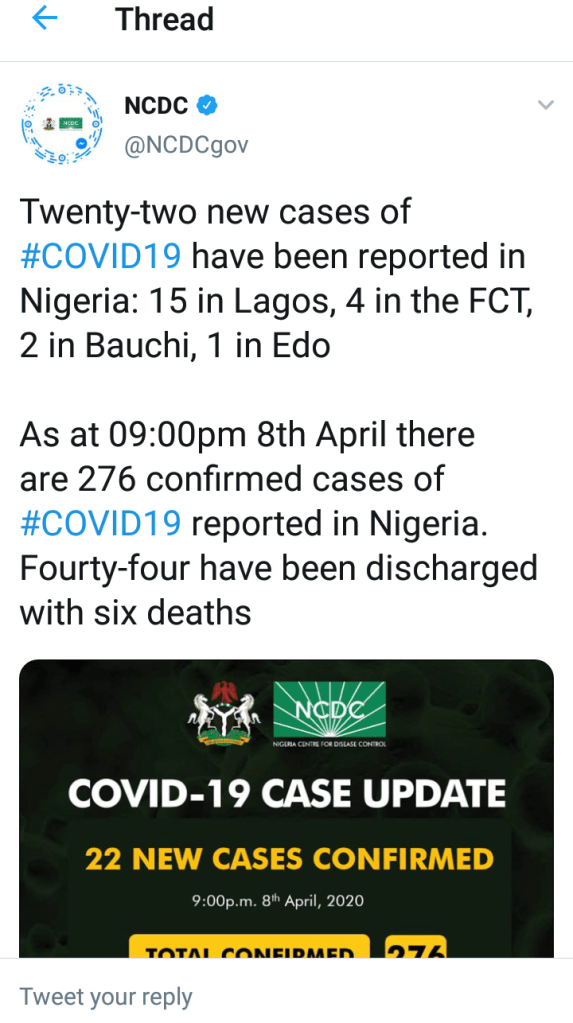 The NCDC says there are 22 new cases of Covid-19 confirmed in Nigeria.That brings the total number of cases confirmed so far to 276.