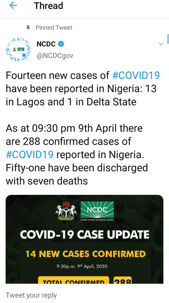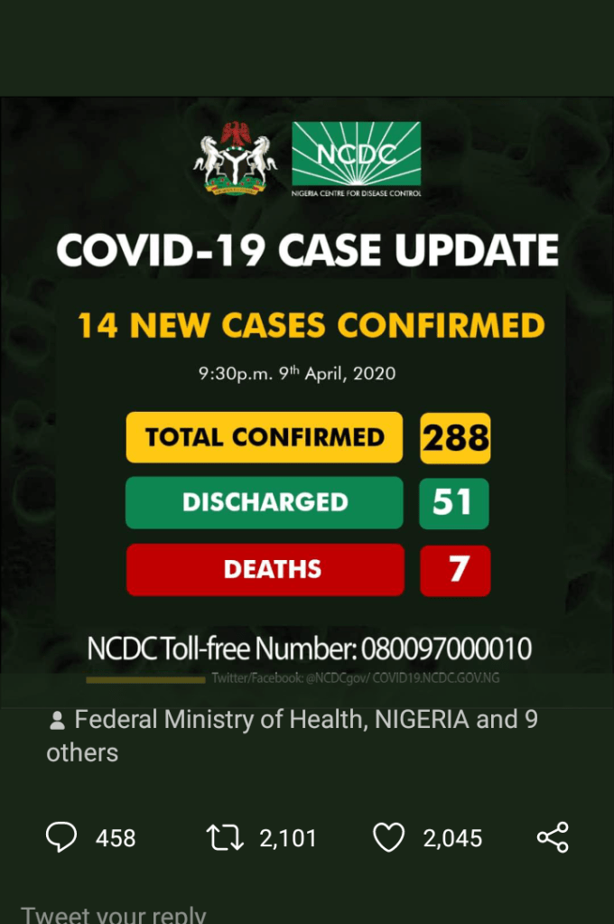 The number of confirmed Covid-19 cases has moved up to 288 with 14 new cases confirmed in Nigeria.