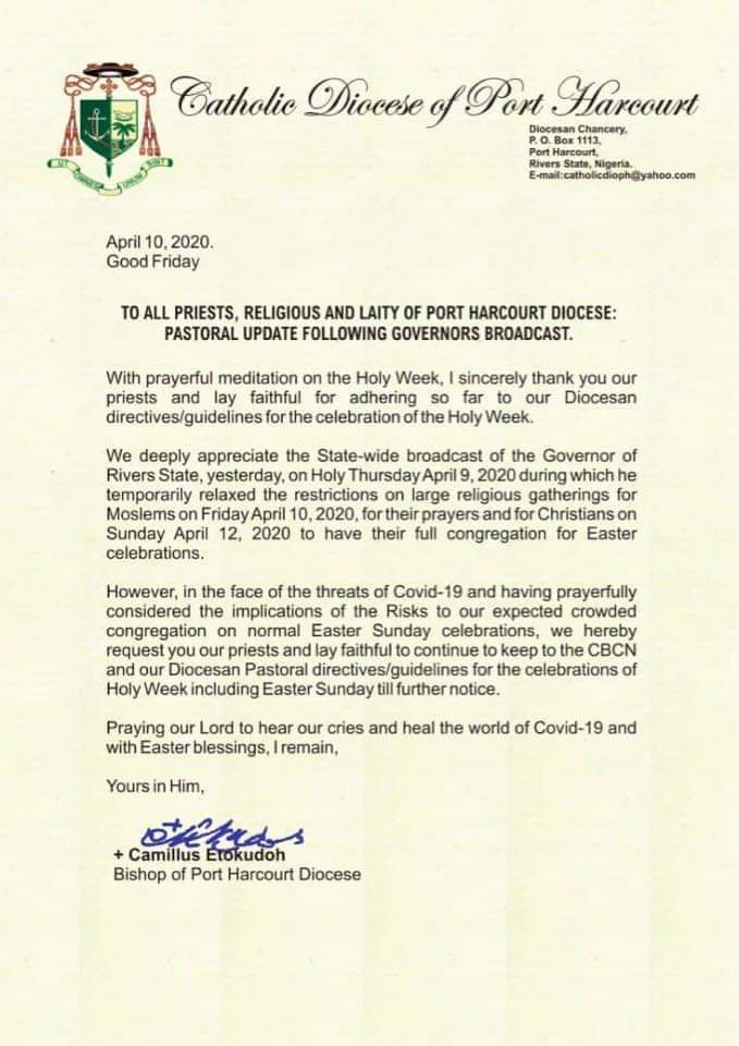 In a letter to Priests, religious and Laity in the diocese, the Bishop said ” having prayerfully considered the implications of the risks to our expected crowded congregation on normal Easter Sunday celebrations, we hereby request you our priest and lay faithful to continue to keep to the CBCN and our diocesan pastoral directives/ guidelines for the celebration of holyweek including Easter Sunday till further notice”.