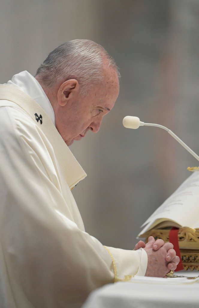 Pope Francis prays as he celebrates the Mass of the Lord’s Supper April 9, 2020, in St. Peter’s Basilica at the Vatican. (CNS photo/Vatican Media via Reuters) See POPE-HOLY-THURSDAY April 9, 2020.