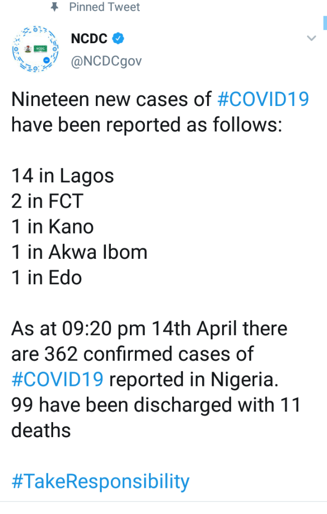 The NCDC announced on its twitter handle 19 new cases.