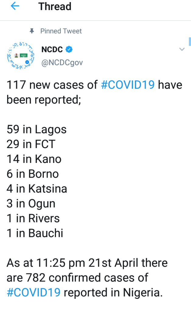 Lagos had 59 cases, FCT 29,Kano 14, Borno 6, Katsina 4,/Ogun 3, Rivers and Bauchi 1 each.