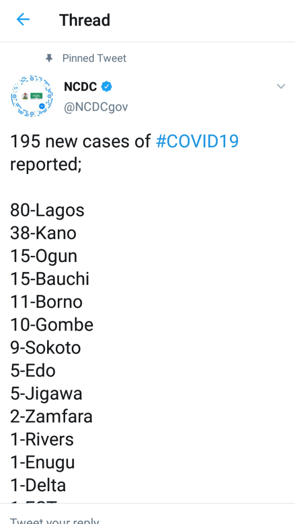 The NCDC has reported 195 fresh cases of Covid-19 in Nigeria. This follows an increased capacity to test as reported by the center.