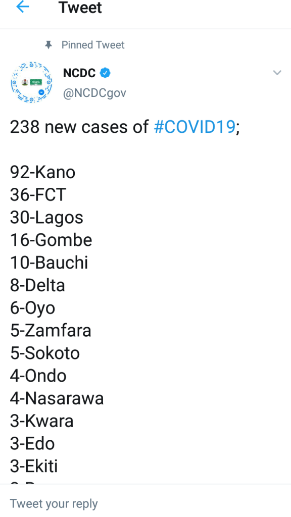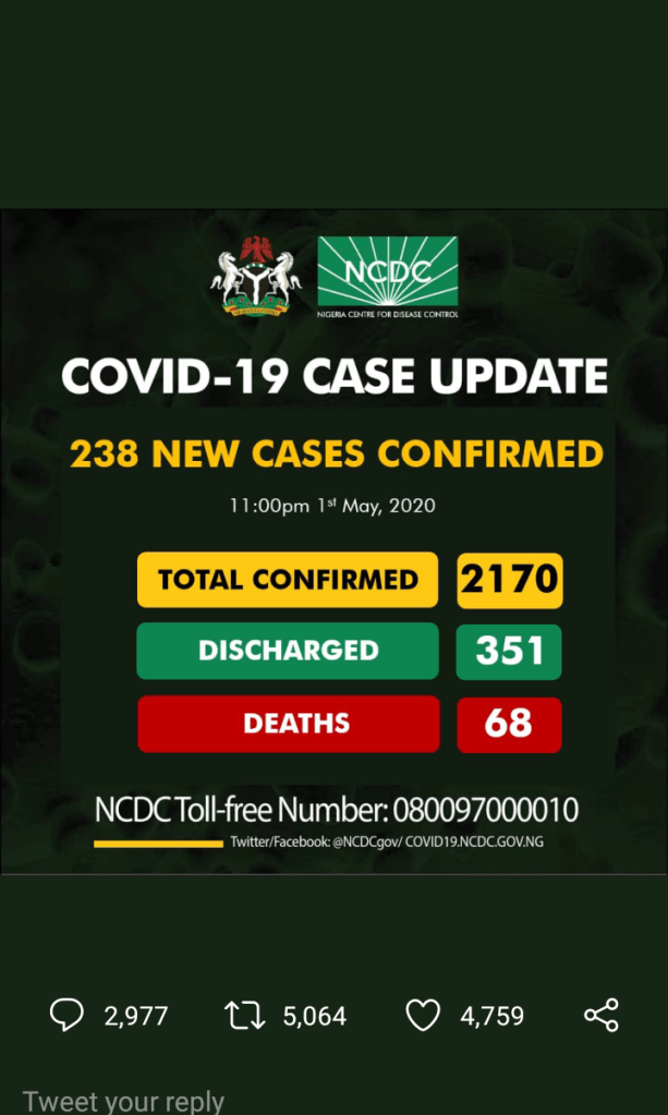 The NCDC has reported 238 fresh cases of Covid-19 in Nigeria.This brings the total number of cases to 2170.
