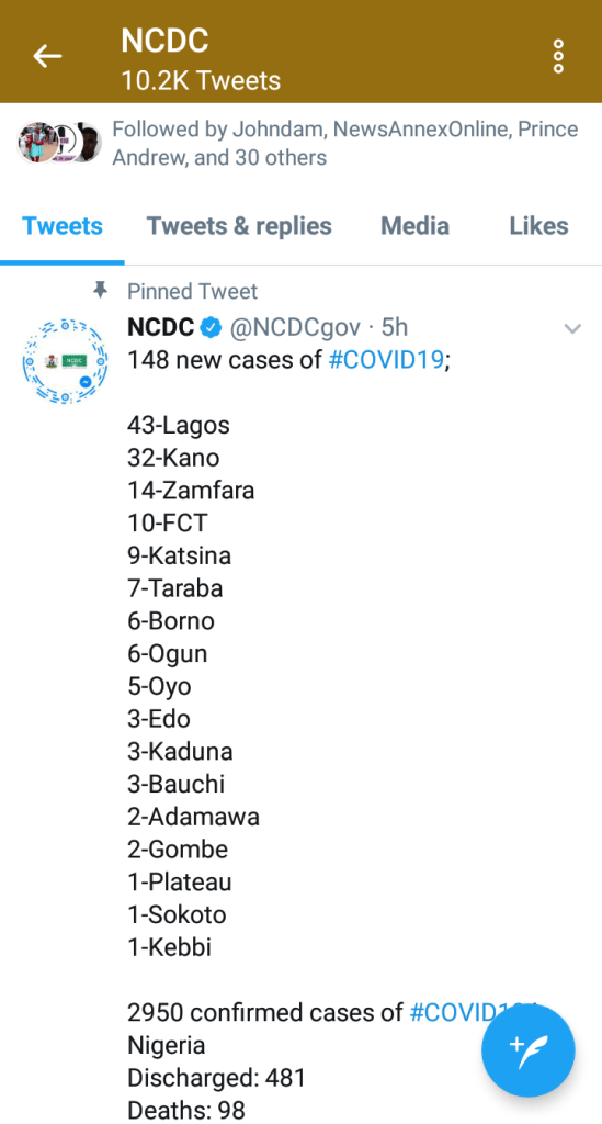 Lagos and Kano have remained at the top of the list as NCDC announces 148 new cases of Covid-19. That brings the total number of cases to 2950.