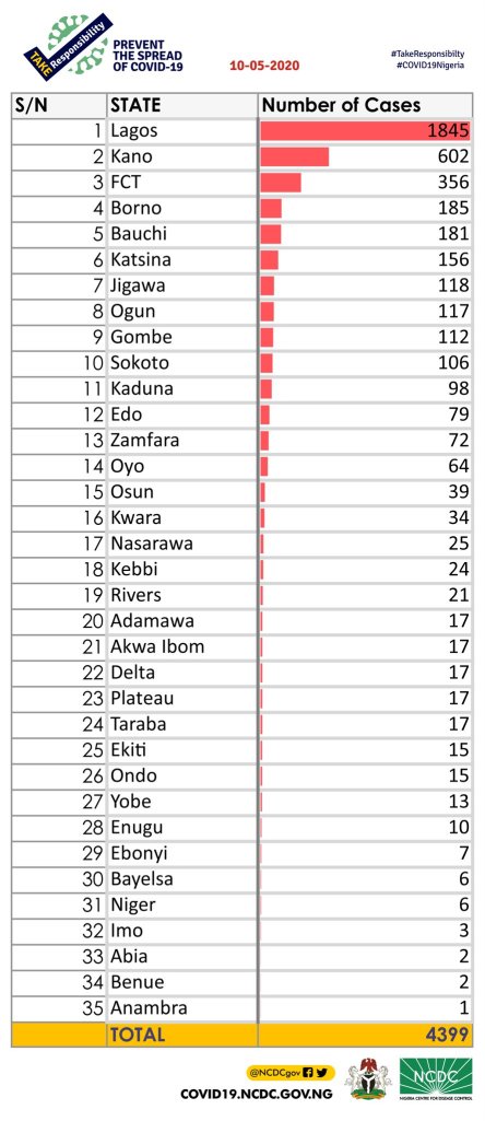 HEALTH COVID-19 NCDC report: Spike in confirmed cases from states_Femi Ehiabhi May 11, 2020 Ehiabhi Femi A breakdown of cases by state are: Rate this:Share this: Click to email a link to a friend (Opens in new window) Email Click to share on WhatsApp (Opens in new window) WhatsApp TweetShare on TumblrLike Loading... Published by Ehiabhi Femi A stickler for what is right and a believer that equal rights and justice precedes Peace! View all posts by Ehiabhi Femi Share this: Click to email a link to a friend (Opens in new window) Email Click to share on WhatsApp (Opens in new window) WhatsApp TweetShare on TumblrLike Loading...