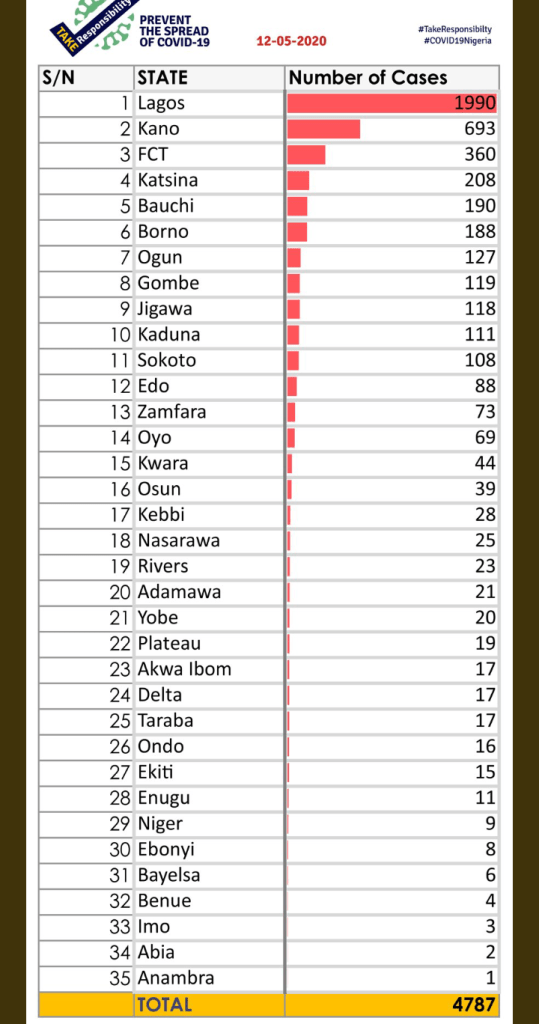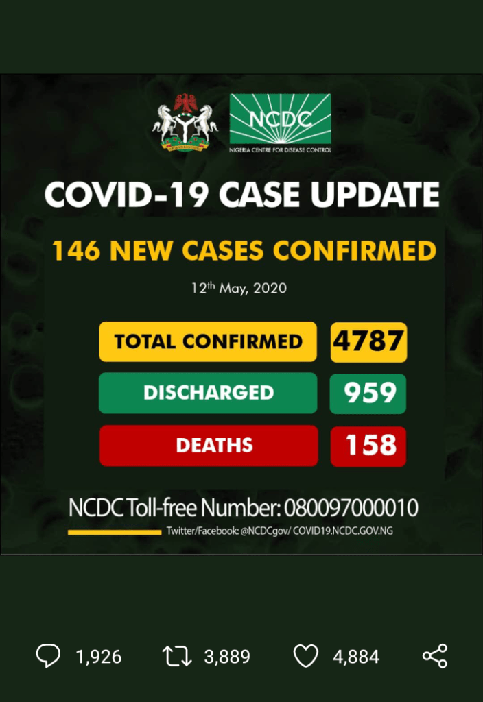 146 cases were recorded and 8 new deaths as at 12th May 2020.