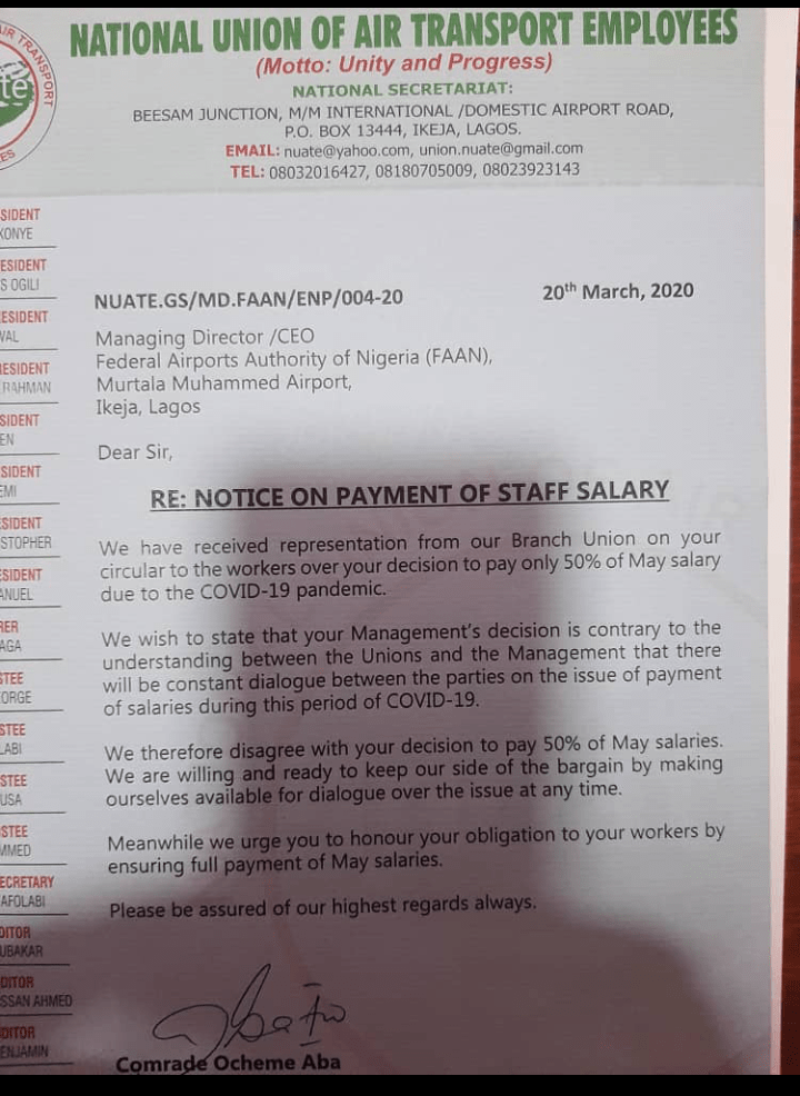 The National Union of Air transport Employees has expressed its disagreement over a planned 50% cut in salaries by the Federal Airport Authority of Nigeria.