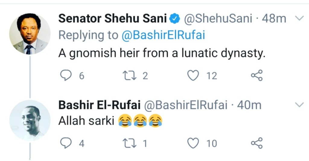 Reacting to Bashir El-Rufai’s post, Senator Sani who was angry with the post fired back at Bashir by referring to him as a ”Gnomish Heir from a Lunatic Dynasty”.
