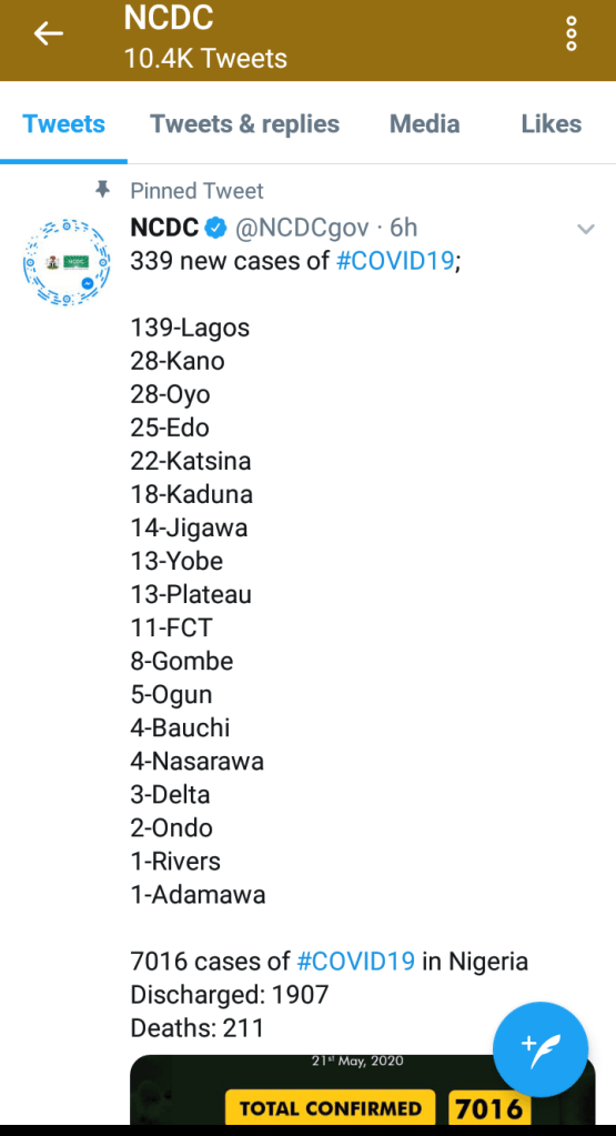 The NCDC has confirmed 339 more cases of Covid-19 in Nigeria. This brings the total number of confirmed cases to 7016.