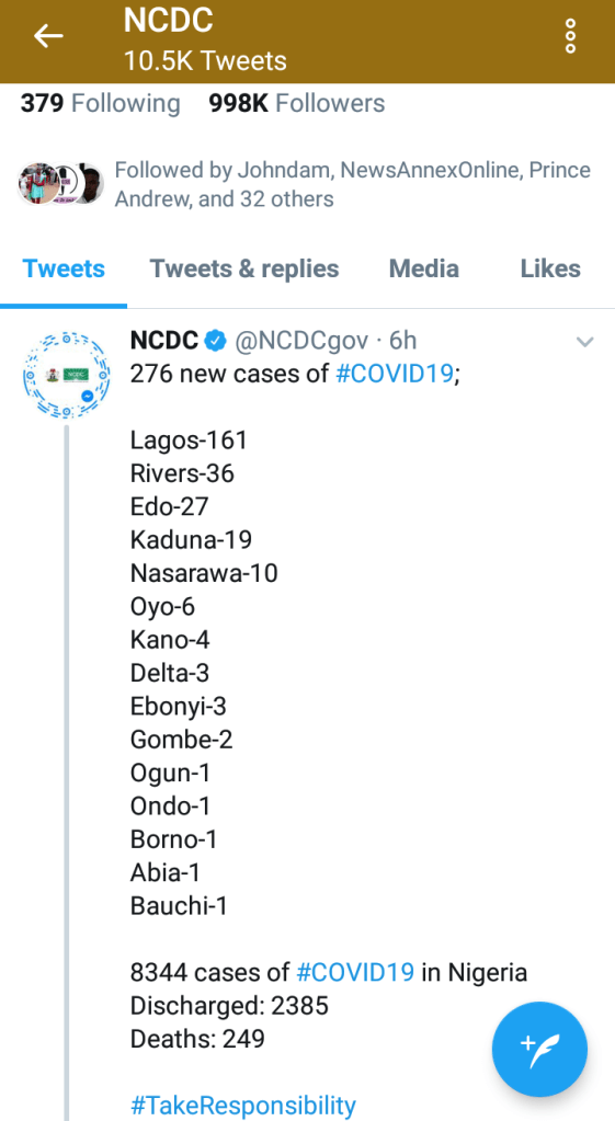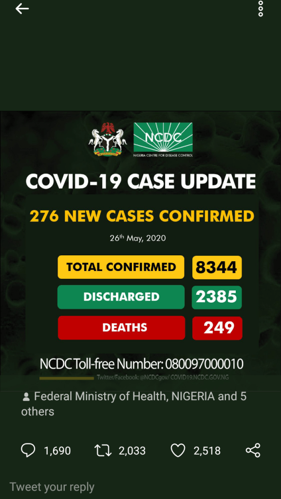 As at 26 May 2020, 276 more cases of Covid-19 have been recorded in Nigeria.