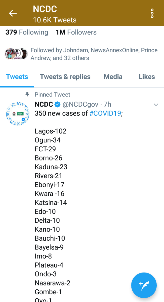 According to the NCDC daily update of 4 June, Lagos has 102, FCT 29, Ogun 34, Born I 26, Kaduna 23,Rivers 21 Ebonyi 17, Kwara 16, Katsina 14.Bottom on the list are Nasarawa 2 cases, Gombe and Oyo 1 case.