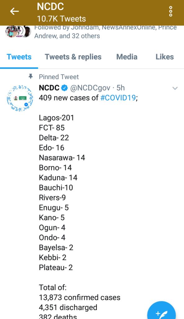 As at 10 June 2020, 409 new cases of Covid-19 has been reported by the NCDC with Lagos State accounting for about half of the cases.