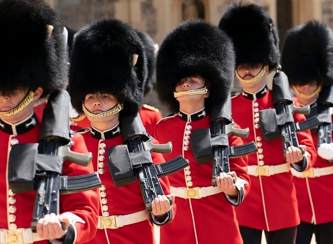 The parade featured soldiers from the Welsh Guards, who observed government virus guidelines to keep at least two metres apart, in a ceremony dubbed “mini-Trooping