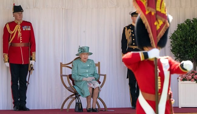 The 94-year-old monarch watched a smaller military parade in the grounds of Windsor Castle, where she has been staying during the COVID-19 outbreak, in her first official public appearance since the country’s virus lockdown began in late March.