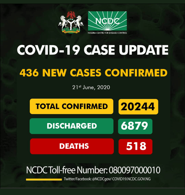 There is a slight reduction in the number of new cases for the first time in days with 436 cases announced by the NCDC.