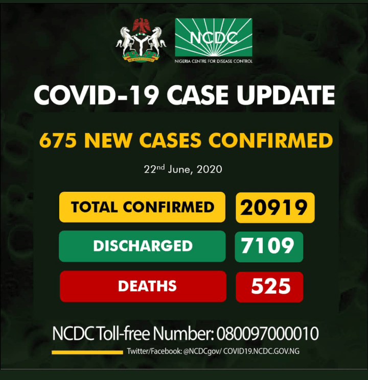 The NCDC has announced 675 more Covid-19 cases in Nigeria. This brings the total number confirmed so far to 20919 out of which 7109 have been discharged and 525 died.