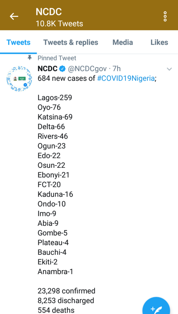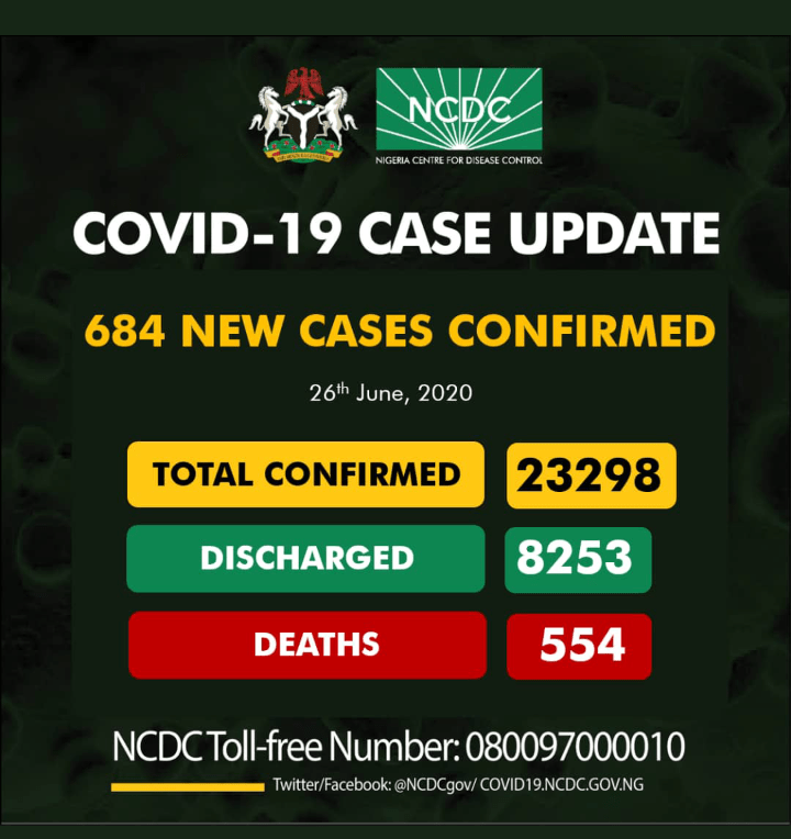 The NCDC has reported 684 new cases of Covid-19 in Nigeria. That brings the total number of cases confirmed so far to 23298. 8253 patients have been discharged so far while 554 have died.