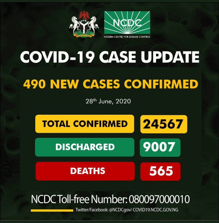 The NCDC has confirmed 490 more Covid-19 cases . This brings the total number of cases confirmed so far to 24567 .