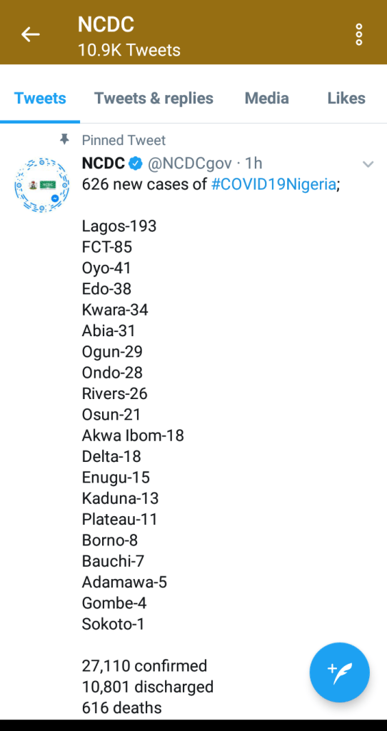 As community phase of infection continues, 626 fresh cases of Covid-19 have been confirmed by the NCDC.