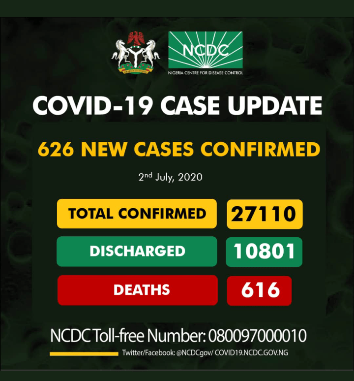 This brings the total number of confirmed cases to 27110. Discharged patients so far are 10801 while 616 have died..