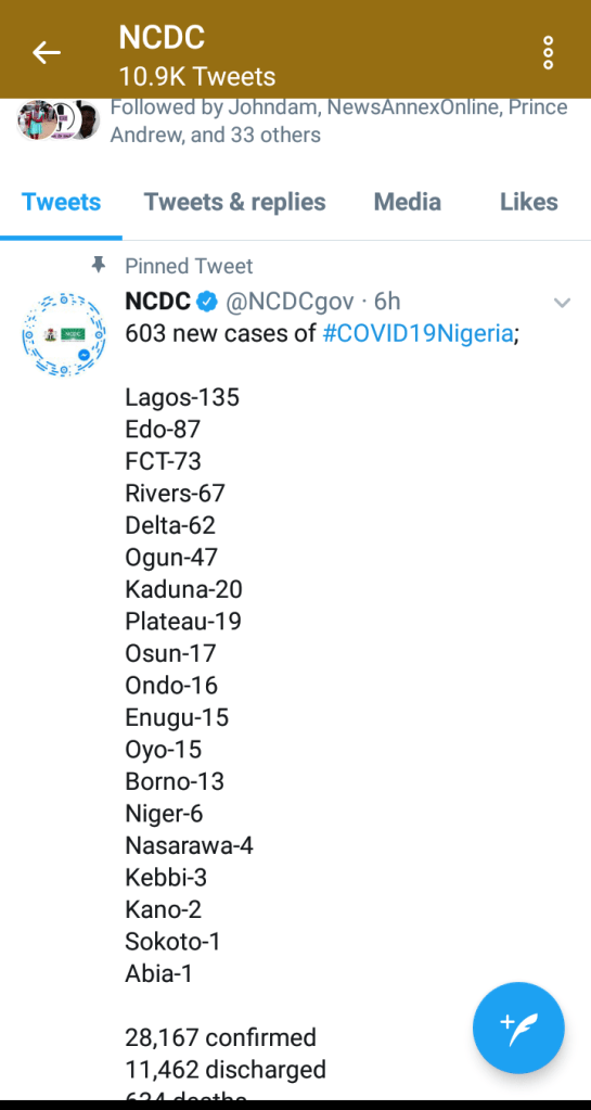 Lagos, Edo and FCT have the highest with 135, 87 and 73 cases respectively while Kebbi , Kano, Sokoto and Abia have the least with 2 cases for the first two and 1 each for the last two.