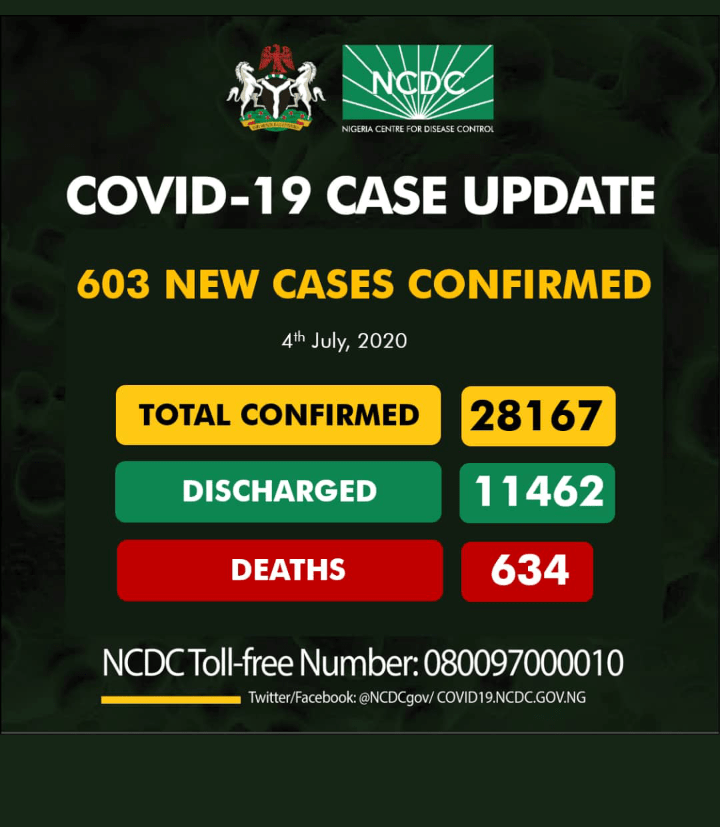 As at July 4, 603 Fresh cases of Covid-19 have been confirmed. The total number of cases confirmed so far is 28167 while 11462 have been discharged and 634 died.