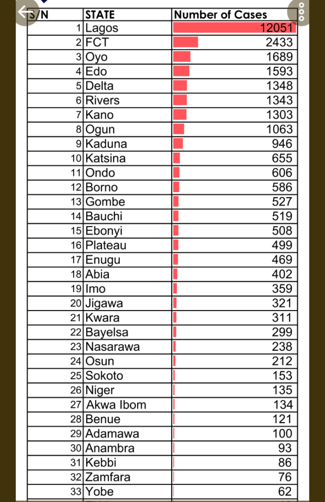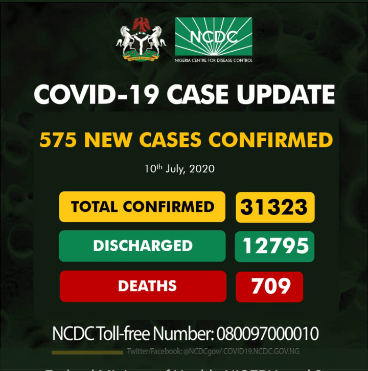 The NCDC has announced 575 more Covid-19 cases in Nigeria. That brings the total number of cases to 31323.12795 patients have been discharged while 709 patients have died so far.