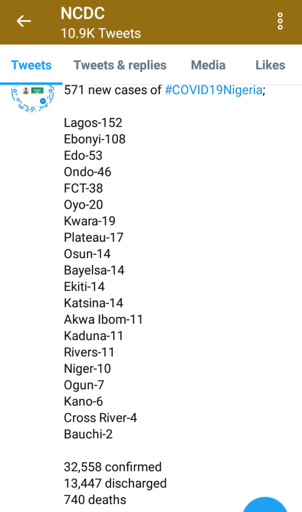 32558 cases have been reported since the pandemic entered Nigeria while 13447 patients have been discharged.