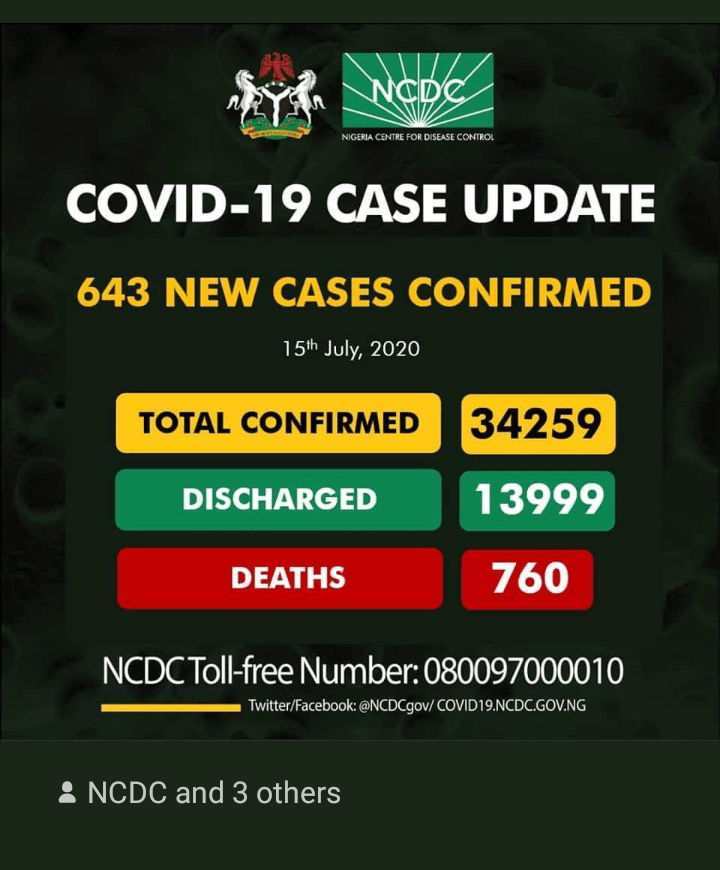 The death toll for Covid-19 has risen to 760 with 643 new cases reported. According to a tweet by the Federal ministry of information and culture, 13999 patients have been discharged while the total number of confirmed cases stands at 34259.