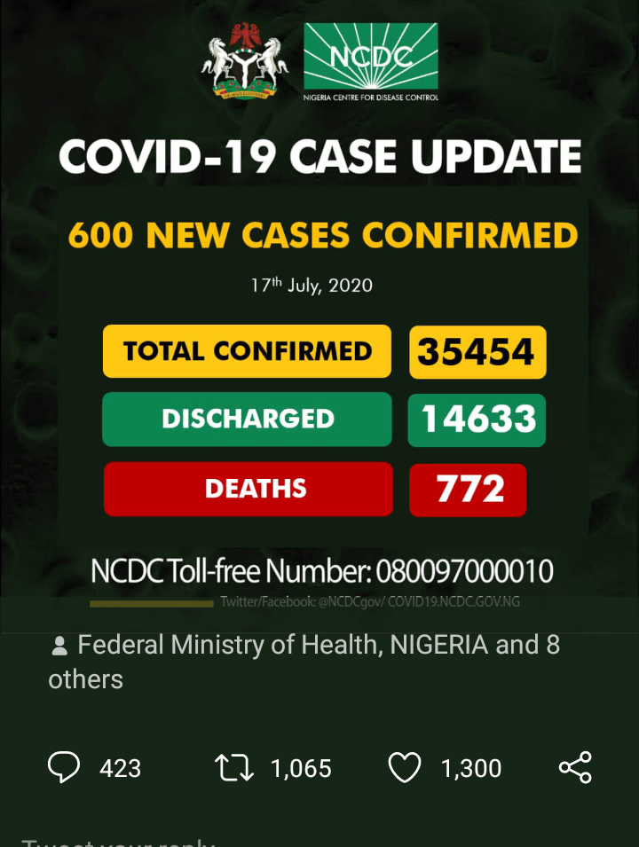 As at today, 600 new cases of Covid-19 have been reported in Nigeria bringing the total number of cases confirmed so far to 35454.14633 patients have been discharged so far while 772 deaths have been recorded.