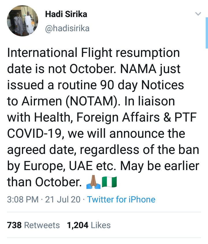 The Minister of Aviation, Hadi Sirika has debunked rumours that International flights will resume October.