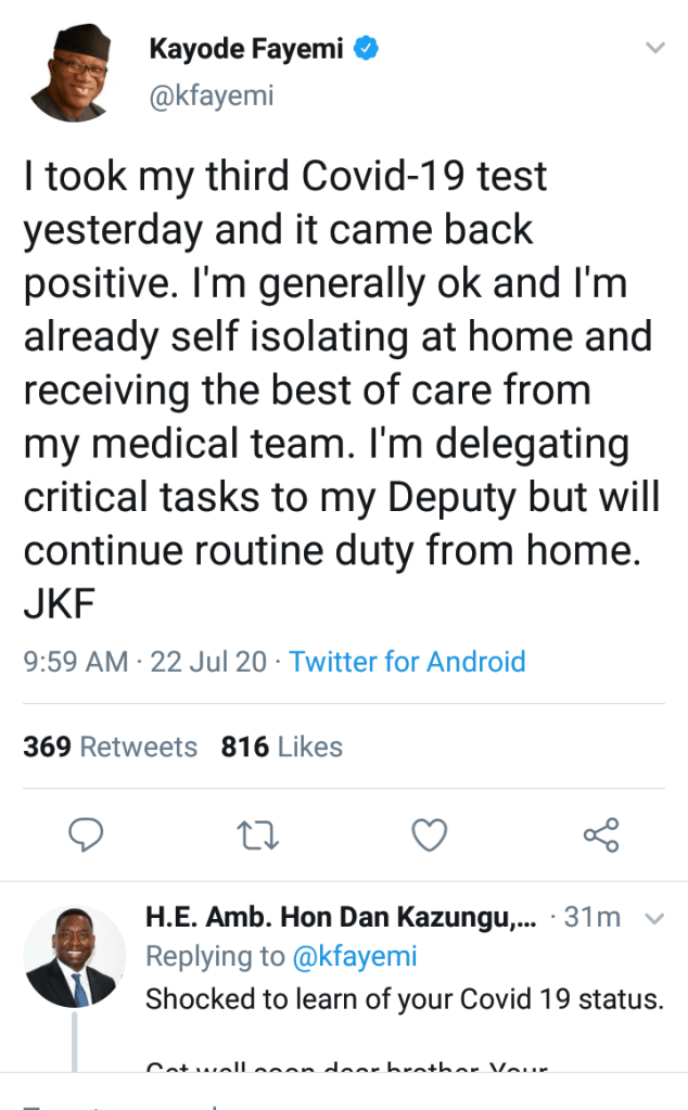 Ekiti state governor, Kayode Fayemi has tested positive for COVID-19.